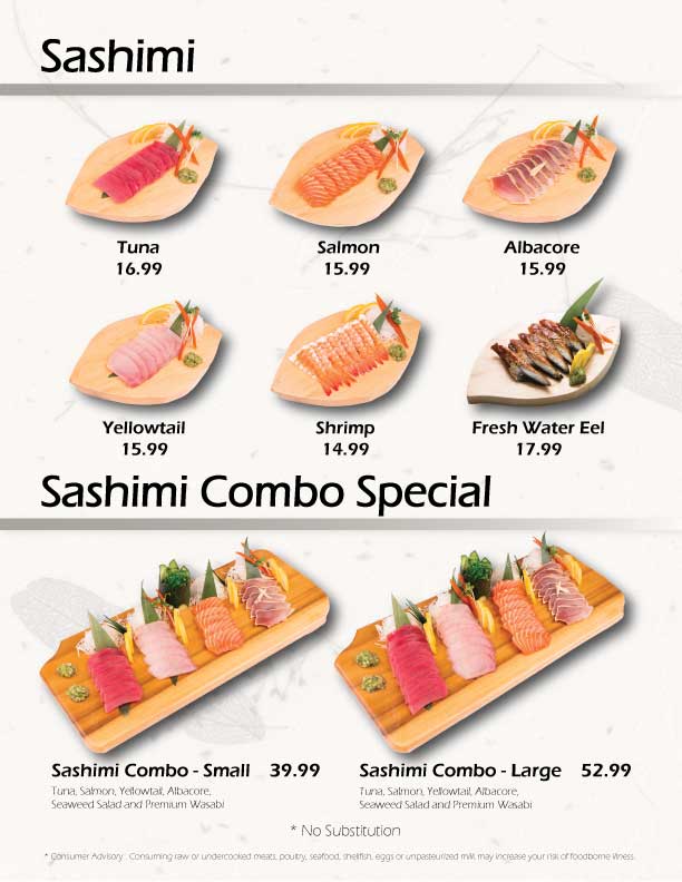 Tuna, salmon, yellowtail, albacore (eight pieces each) seaweed salad and premium wasabi. no substitution